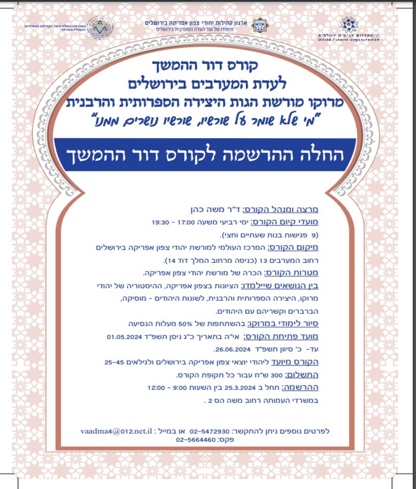 החלה ההרשמה לקורס “דור ההמשך” לעדת המערבים בירושלים מועד הפתיחה 1.5.2024 לפרטים ורישום: במשרד העמותה ברחוב משה הס 2 ירושלים, ניתן להתקשר ל- 02-5472930 או במייל – vaadma4@012.net.il פקס- 02-5664460 אנחנו צריכים אתכם איתנו, שותפים, משתפים ומרחיבים את תפוצת המתעניינים במורשת המדהימה של יהדות צפון אפריקה.